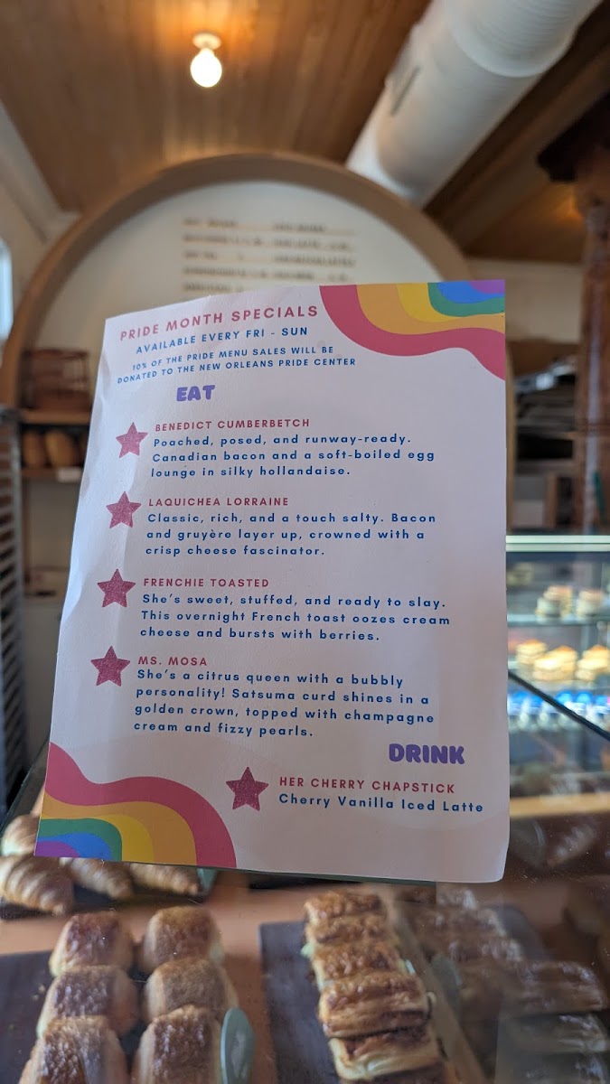 The menu features a range of baked goods and savory bites—from flaky croissants and richly layered king cakes to more savory offerings like the Parm and Chive Biscuits and the distinctive Muffaletta Breadsticks. Morning visitors can enjoy simple breakfast choices like scrambled egg rolls or yogurt parfaits, while those seeking a midday meal will find satisfying sandwiches and fresh salads that feel equally fresh and approachable.